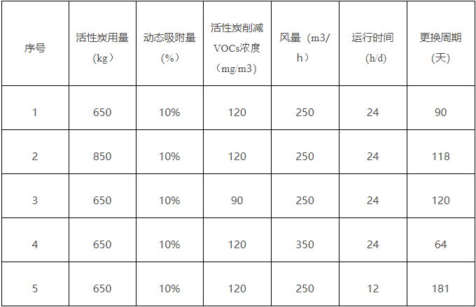 計算示例:下表中,后四組分別對第一組數(shù)據(jù)的活性炭用量、活性炭削減VOCs濃度、風量、運行時間進行改變,得出不同的更換周期。